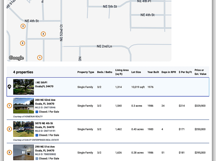 Fully rehabbed homes in the 34470 zip code are consistently selling between $175–$215/sf, with private pool homes sitting at the top of that range. The strongest comp, 200 NE 52nd Ave, recently sold for $329,900 ($214/sf) after a high-end renovation and roof replacement. Based on the subject’s square footage (1,314 sf) and private pool: