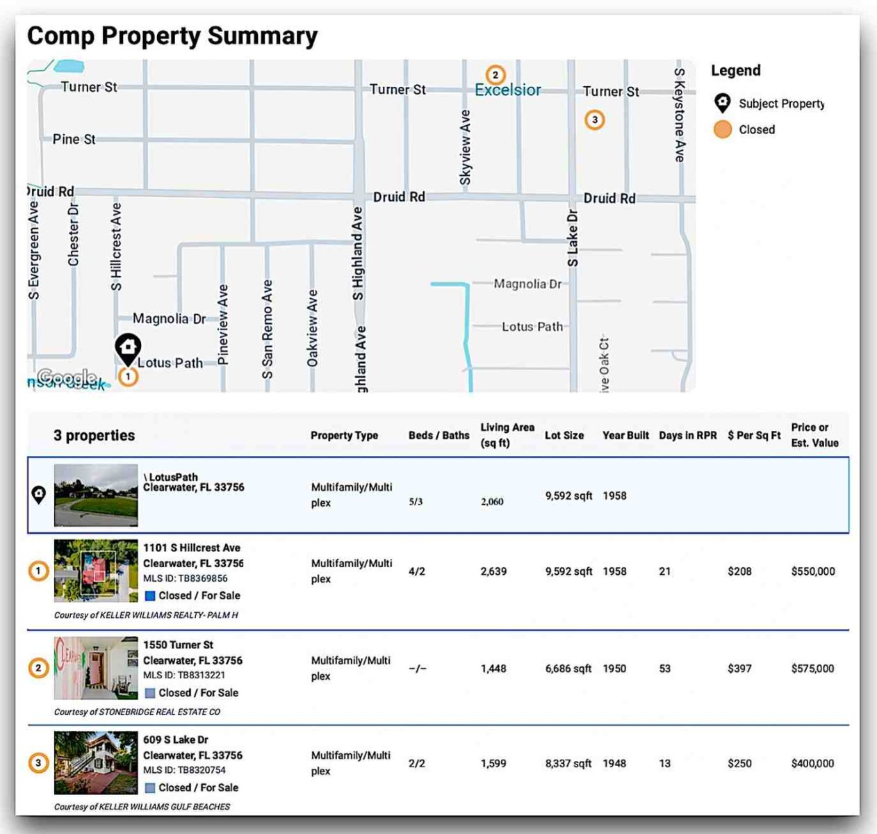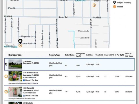 This 2-unit multifamily property at 1400 Lotus Path offers a total of 2,060 sf of living area on a 9,592 sf lot, built in 1958. The layout includes a 3 bed / 2 bath unit with carport and a 2 bed / 1 bath unit with carport — each with separate entries and utilities, ideal for owner-occupant or rental income. Located minutes from downtown Clearwater, Morton Plant Hospital, and the beaches, the duplex sits in a high-demand rental corridor with solid long-term appreciation.
