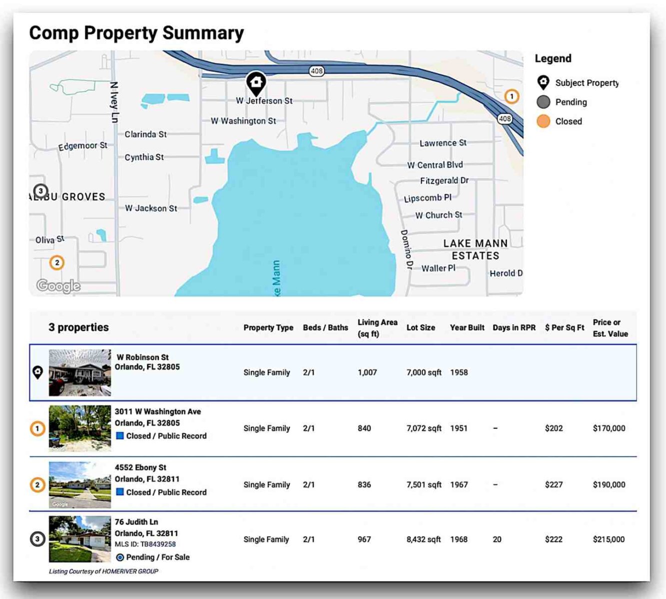 This 2-bed, 1-bath, 1,007 sf block home built in 1958 sits on a 7,000 sf lot with a carport in the Lake Mann area of Orlando. The property is clean, functional, and mostly rehabbed inside.